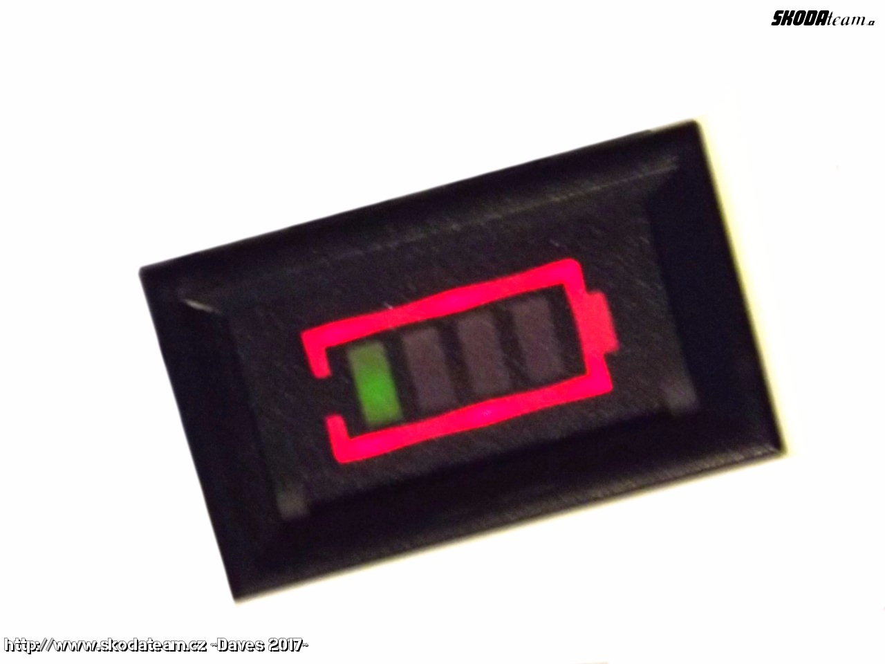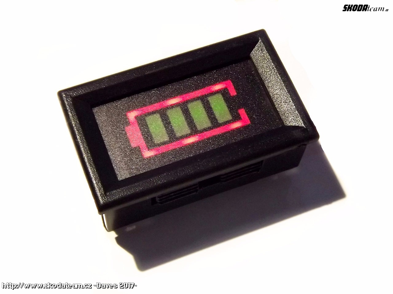 Měřič napětí baterie 12V do panelu. Ukazuje 0 až 4 zelené čárky v závislosti na napětí.